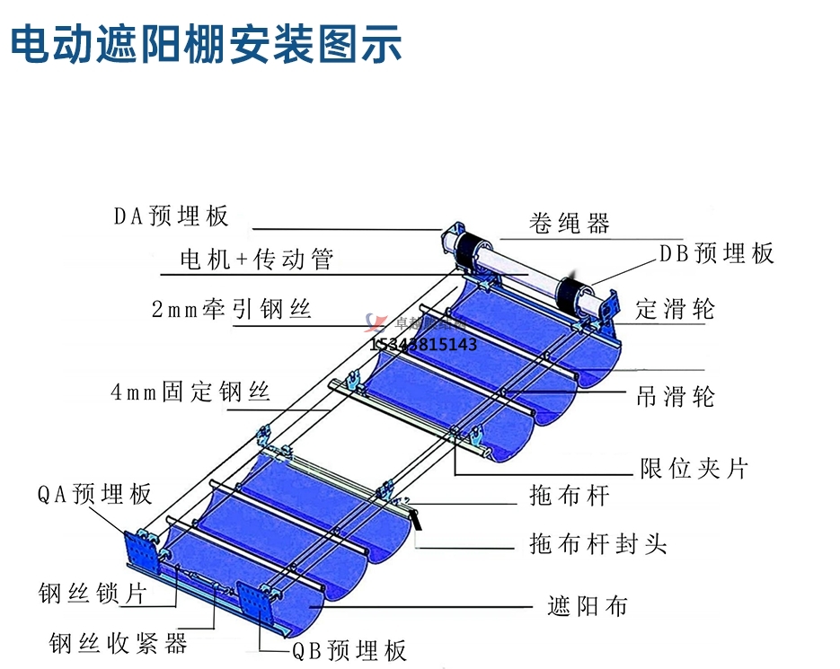 幼兒園FCS折疊遮陽(yáng)天棚即使用管狀電機(jī),利用鋼絲循環(huán)運(yùn)動(dòng),從而帶動(dòng)面料收放,達(dá)到遮陽(yáng)的效果。FCS折疊遮陽(yáng)天棚機(jī)構(gòu)分為傳動(dòng)和面料兩大部分:上方傳動(dòng)部分的另一端為動(dòng)力端,利用管狀電機(jī)旋轉(zhuǎn)帶動(dòng)卷管及固定在卷管上的卷繩器旋轉(zhuǎn)從而是一根鋼絲繩進(jìn)行收放。傳動(dòng)部分的另一端為滑輪鋼絲通過(guò)滑輪進(jìn)行換向,使一根鋼絲的兩端能同時(shí)固定卷繩器上,并且鋼絲始終保持繃緊。面料部分的上半部分是一根兩端固定并繃緊的鋼絲(天棚簾跨度過(guò)大的改用滑動(dòng)門(mén)軌),下半部分為面料,面料從頂端開(kāi)始安裝牽引桿,間距等分(通常為0.8米左右)。牽引桿上安裝流動(dòng)滑輪,滑輪在固定在鋼絲上運(yùn)行。第一根牽引桿與傳動(dòng)鋼絲連接,在電機(jī)固定鋼絲展開(kāi)與收攏。