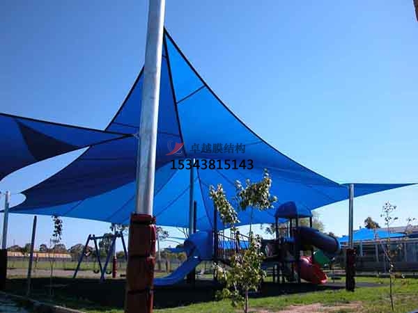 張拉膜景觀遮陽(yáng)棚的特點(diǎn):張拉膜景觀遮陽(yáng)棚具有輕質(zhì)高強(qiáng)、造型多樣、透光性好、耐候性強(qiáng)、施工快捷、環(huán)保節(jié)能、功能復(fù)合、維護(hù)簡(jiǎn)便等多種特點(diǎn)。其采用高強(qiáng)度纖維織物,如聚酯纖維或玻璃纖維,表面涂覆PVC或PTFE等涂層,重量輕但承載能力出色,適合大跨度結(jié)構(gòu),能減少基礎(chǔ)結(jié)構(gòu)的負(fù)擔(dān)。膜材具有高度的可塑性,通過(guò)鋼索或骨架張拉,可形成流線型、曲面等豐富的造型,如曲線、動(dòng)態(tài)形狀等,能夠與自然景觀或周?chē)h(huán)境相融合,創(chuàng)造出獨(dú)特的視覺(jué)效果,成為景觀中的亮點(diǎn)。部分膜材透光率可達(dá)10%-40%,白天可充分利用自然光,減少人工照明能耗,同時(shí)營(yíng)造明亮舒適的空間氛圍;夜晚燈光透射可形成獨(dú)特的光影效果,增強(qiáng)景觀的藝術(shù)感染力。膜材表面經(jīng)過(guò)特殊涂層處理,具備抗紫外線、耐腐蝕、防水、自潔等性能,能夠適應(yīng)各種惡劣的戶外氣候條件,延長(zhǎng)使用壽命,減少維護(hù)成本。其構(gòu)件多在工廠預(yù)制,現(xiàn)場(chǎng)安裝簡(jiǎn)便,施工周期短,對(duì)場(chǎng)地的影響小,能夠快速搭建完成,盡快投入使用,尤其適合一些緊急或臨時(shí)性的項(xiàng)目。多數(shù)膜材料可回收利用,符合可持續(xù)發(fā)展理念;其透光性和保溫性能有助于降低能耗,減少對(duì)環(huán)境的影響。張拉膜景觀遮陽(yáng)棚兼具遮陽(yáng)、擋雨、防風(fēng)、空間劃分、藝術(shù)裝飾等多重功能,還可以與其他設(shè)施如噴霧降溫設(shè)備、照明設(shè)備等相結(jié)合,提供更豐富的使用體驗(yàn)。其表面光滑不易積塵,日常僅需簡(jiǎn)單清潔,定期檢查節(jié)點(diǎn)和膜面狀況即可保障結(jié)構(gòu)的安全和正常使用,維護(hù)成本較低。