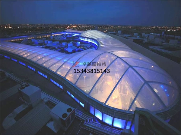 ETFE更早由杜邦公司于七十年代研發(fā),作為一種輕質(zhì)、阻熱的薄膜,可用作航空工業(yè)中的覆蓋層。從那時(shí)起,這種薄膜被零星的應(yīng)用于農(nóng)業(yè)和建筑領(lǐng)域,例如溫室的覆蓋層和太陽能板保護(hù)層。之后,在2001年,這種材料迎來了第次大規(guī)模應(yīng)用,作為英國康沃爾郡“伊甸園計(jì)劃”(Eden Project)巨大圓形溫室的表面膜材料。該項(xiàng)目是巴克敏斯特·富勒(Buckminster Fuller)的蒙特利爾生物圈概念的進(jìn)化版。奧雅那(Arup)作為工程顧問公司,選擇了ETFE,因其可靠的建筑環(huán)境調(diào)節(jié)能力,可以通過在膜上打印特定的紋理并將其層疊來調(diào)節(jié)光照,這對于建立一個(gè)適合特定植物生長的人工氣候是十分必要的。另外,建筑師發(fā)現(xiàn)ETFE的低摩擦系數(shù)可以防止塵土粘附在表面,從而減少維護(hù)成本。