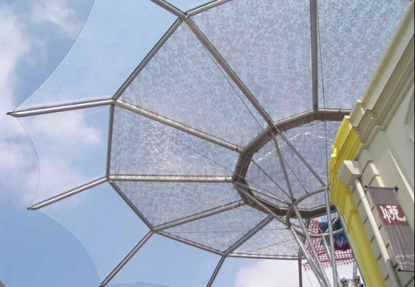 ETFE薄膜常被制作成雙層或多層氣枕的形式而應(yīng)用于膜結(jié)構(gòu)建筑中,即將ETFE薄膜按照建筑師設(shè)計(jì)的形狀(可以是圓形、橢圓形、三角形、矩形、多邊形或其他任意形狀)剪裁、焊接,通過鋁合金或輕質(zhì)鋼材的邊框構(gòu)件將各獨(dú)立氣枕連接在一起形成一個(gè)大覆蓋空間。每個(gè)獨(dú)立氣枕帶有供氣系統(tǒng)與充氣設(shè)備相連,氣枕內(nèi)部維持一定的氣體壓力起到保持氣枕形狀、承載及傳遞外部載荷、隔熱、隔音、調(diào)節(jié)建筑內(nèi)部光線等功能以滿足建筑物理學(xué)的需要。