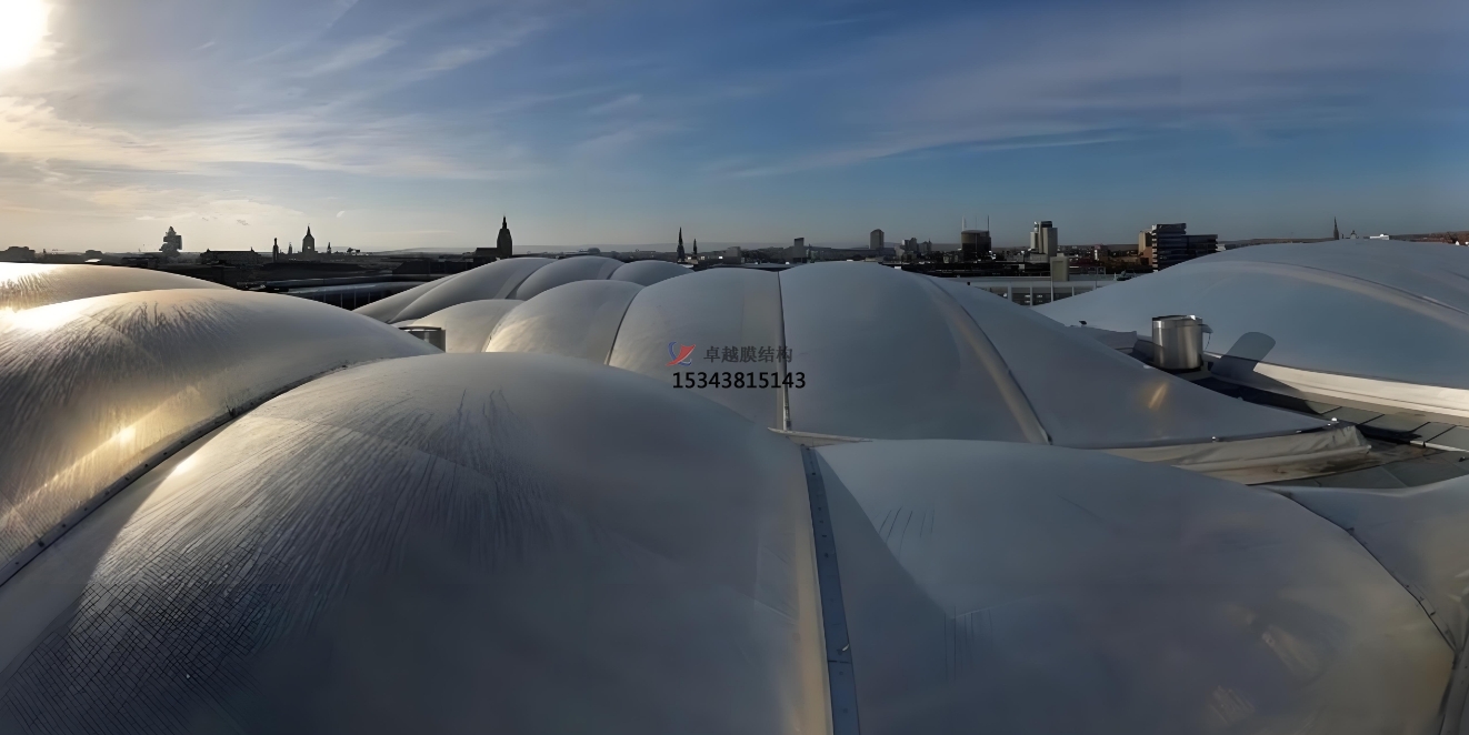 它們都需要采用專門的鋁合金支架進(jìn)行支撐固定,并且根據(jù)一定規(guī)律分割成膜單元。單層ETFE膜外觀造型比較簡(jiǎn)單,看起來和玻璃相近;雙(多)層氣枕膜需要使用專業(yè)的充氣系統(tǒng)進(jìn)行智能充氣,保持膜氣枕鼓起,從而獲得立體的氣泡美感和良好的保溫隔熱性能。