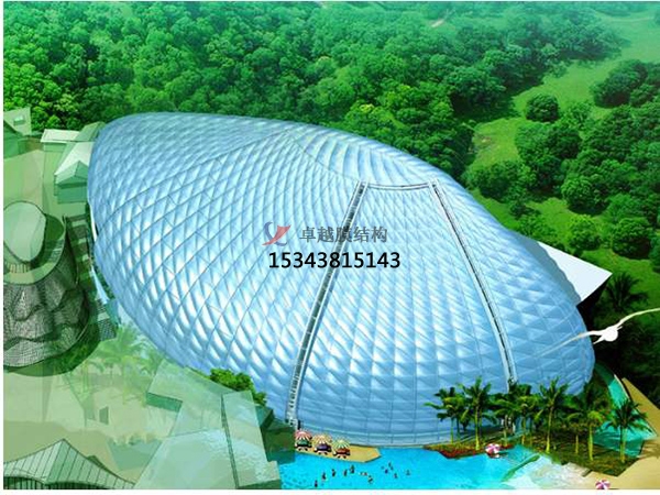 ETFE膜材料多用于跨距為4m的兩層或三層充氣支撐結(jié)構(gòu),也可根據(jù)特殊工程的幾何和氣候條件,增大膜跨距。膜長(zhǎng)度以易安裝為標(biāo)準(zhǔn),一般為15m~30m。小跨度的單層結(jié)構(gòu)也可用較小規(guī)格。ETFE 膜材常做成氣墊應(yīng)用于膜結(jié)構(gòu)中。更早的ETFE 工程已有20 余年的歷史,而更著名的要數(shù)英國(guó)的伊甸園。2008 北京奧運(yùn)工程——水立方就采用了ETFE 膜材料,而鳥巢則是這兩種膜材都有應(yīng)用。