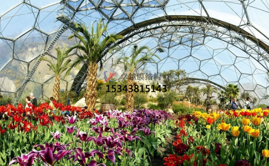 為了滿足室內(nèi)植物的采光條件,該館穹頂全部采用輕盈的ETFE膜覆蓋,“三膜兩腔”的膜結(jié)構(gòu)充氣后就像一個巨大的泡泡,通過充氣量的多少來調(diào)節(jié)室內(nèi)溫度,從而營造一個節(jié)能、環(huán)保、可持續(xù)的熱帶植物 “成長樂園”。