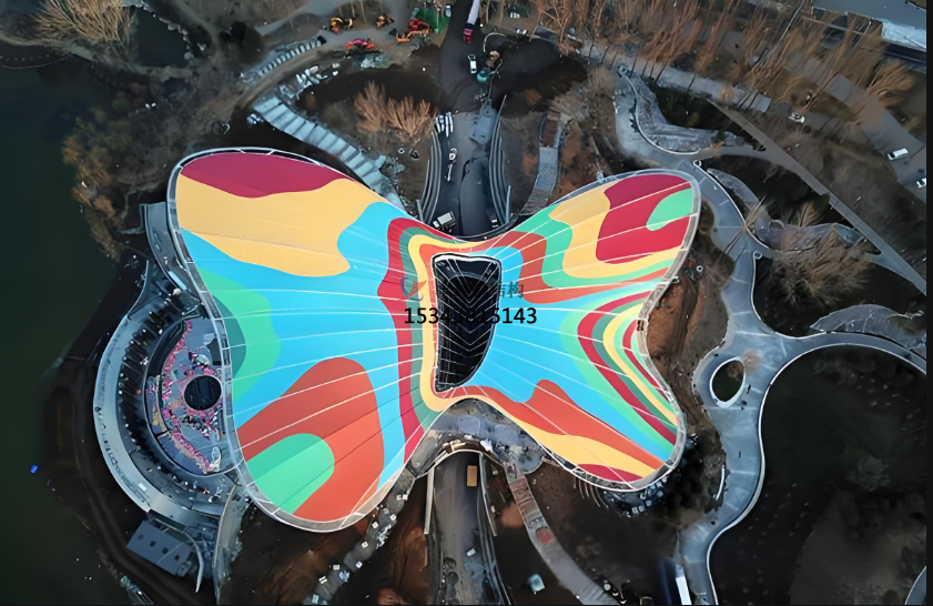 ETFE膜材除了常規(guī)的透明、藍色、白色、銀色鍍點外,其實還有五顏六色的彩色系列。今天就給大家介紹一個ETFE彩色膜應用的經典案例2019年北京世園會的主場館——媯汭劇場,外觀為彩色蝴蝶造型。