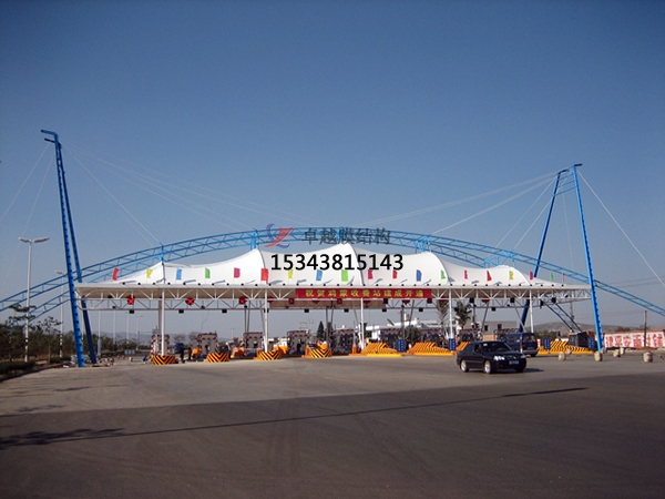 四、收費(fèi)站膜結(jié)構(gòu)罩棚在結(jié)構(gòu)的穩(wěn)定性,耐久性、抗風(fēng)性、抗雨雪性對比傳統(tǒng)的彩鋼板有著不可比擬的優(yōu)勢,膜結(jié)構(gòu)本身的應(yīng)力結(jié)構(gòu)在遇到雨雪天氣膜結(jié)構(gòu)本身的結(jié)構(gòu)特性也可以保證其大跨度的抗壓穩(wěn)定性。