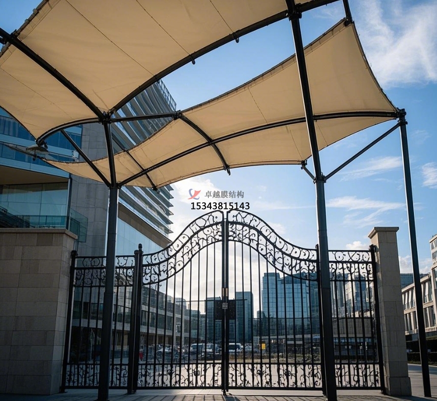 膜結(jié)構(gòu)大門(mén)還具備良好的遮陽(yáng)功能。炎炎夏日,膜材能夠?yàn)榫用駬纹鹨黄鍥龅目臻g,無(wú)論是步行進(jìn)出小區(qū)的居民,還是在門(mén)口短暫停留等待的人員,都能免受烈日的炙烤。部分膜材具有一定的透光性,在遮陽(yáng)的同時(shí),還能讓自然光適度透入,使大門(mén)內(nèi)部空間明亮舒適,避免因光線不足而產(chǎn)生的昏暗壓抑感。此外,膜結(jié)構(gòu)大門(mén)還可以根據(jù)需要設(shè)置一些附屬設(shè)施,如在大門(mén)兩側(cè)安裝宣傳欄,用于發(fā)布小區(qū)通知、活動(dòng)信息等,方便居民及時(shí)了解小區(qū)動(dòng)態(tài)。