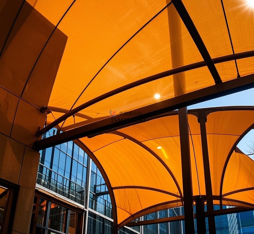 小區(qū)大門(mén)膜結(jié)構(gòu)選用的膜材具有出色的物理性能。首先,其防水性能極佳,能有效抵御各種惡劣天氣下的雨水侵襲,為進(jìn)出小區(qū)的居民遮風(fēng)擋雨,確保居民在雨天也能干爽通行。其次,膜材的抗紫外線能力很強(qiáng),能有效阻擋陽(yáng)光中的有害紫外線,延緩膜材老化,保證大門(mén)長(zhǎng)期使用后依然能保持良好的外觀和性能。這不僅延長(zhǎng)了膜結(jié)構(gòu)大門(mén)的使用壽命,降低了維護(hù)成本,還為居民提供了一個(gè)防曬的過(guò)渡空間,減少了陽(yáng)光直射對(duì)人體的傷害。