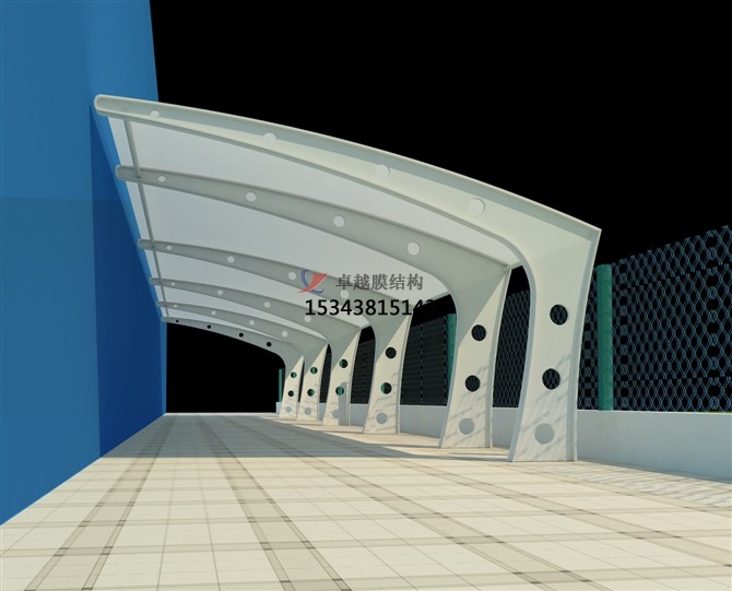 膜結(jié)構(gòu)雨棚是一種全新的建筑結(jié)構(gòu)形式,它集建筑學(xué)、結(jié)構(gòu)力學(xué)、精細(xì)化工與材料科學(xué)、計(jì)算機(jī)技術(shù)等為一體,具有很高技術(shù)含量。其曲面可以隨著建筑師的設(shè)計(jì)需要任意變化,結(jié)合整體環(huán)境,建造出標(biāo)志性的形象工程。