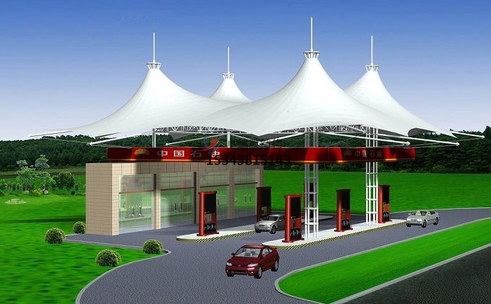 尖頂加油站張拉膜結(jié)構(gòu)效果圖展,常見(jiàn)的加油站張拉膜結(jié)構(gòu)是尖頂?shù)木佣?,白色pvc材質(zhì)的膜也是居多,看上去干凈整潔,而且是阻燃材料,防火,防潮,使用周期久,易于護(hù)理和維護(hù),也是成為眾多加油站的不二之選。