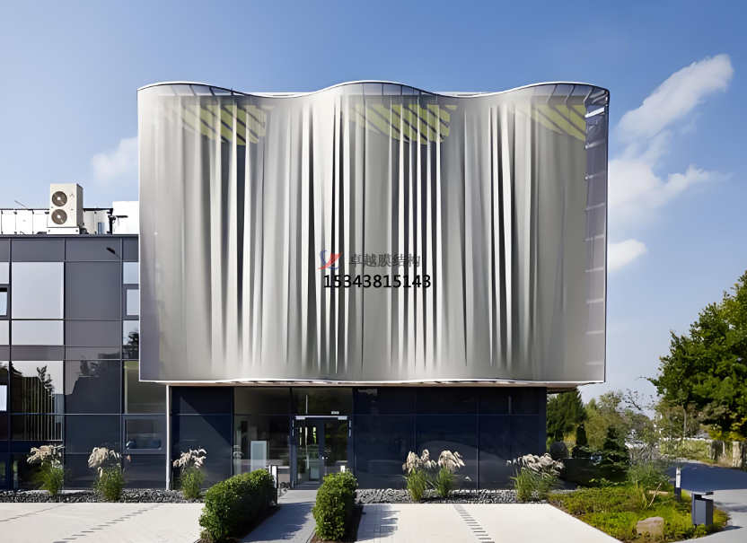膜結(jié)構(gòu)幕墻是膜結(jié)構(gòu)在建筑外圍護(hù)結(jié)構(gòu)的應(yīng)用,以耐候性的柔性織物作為圍護(hù)材料,結(jié)合框架系統(tǒng),對既有建筑的外立面進(jìn)行翻新改造或新建筑外立面設(shè)計應(yīng)用的一種建筑外立面解決方案。膜結(jié)構(gòu)充滿張力且富于變化的曲面,自在靈敏的大空間、透明半透明膜材所構(gòu)成的明亮而又溫和的室內(nèi)環(huán)境,桅桿、拉索、精致的金屬節(jié)點(diǎn)等所表現(xiàn)的富有現(xiàn)代氣息的結(jié)構(gòu)技術(shù),給人們提供了有別于傳統(tǒng)幕墻結(jié)構(gòu)的全新視覺感受,它具有環(huán)保節(jié)能、可100%回收再利用、施工方便、重量輕、高強(qiáng)、高彈、高透光性、柔軟流暢、造型美觀、結(jié)構(gòu)固定簡單等特點(diǎn)。
