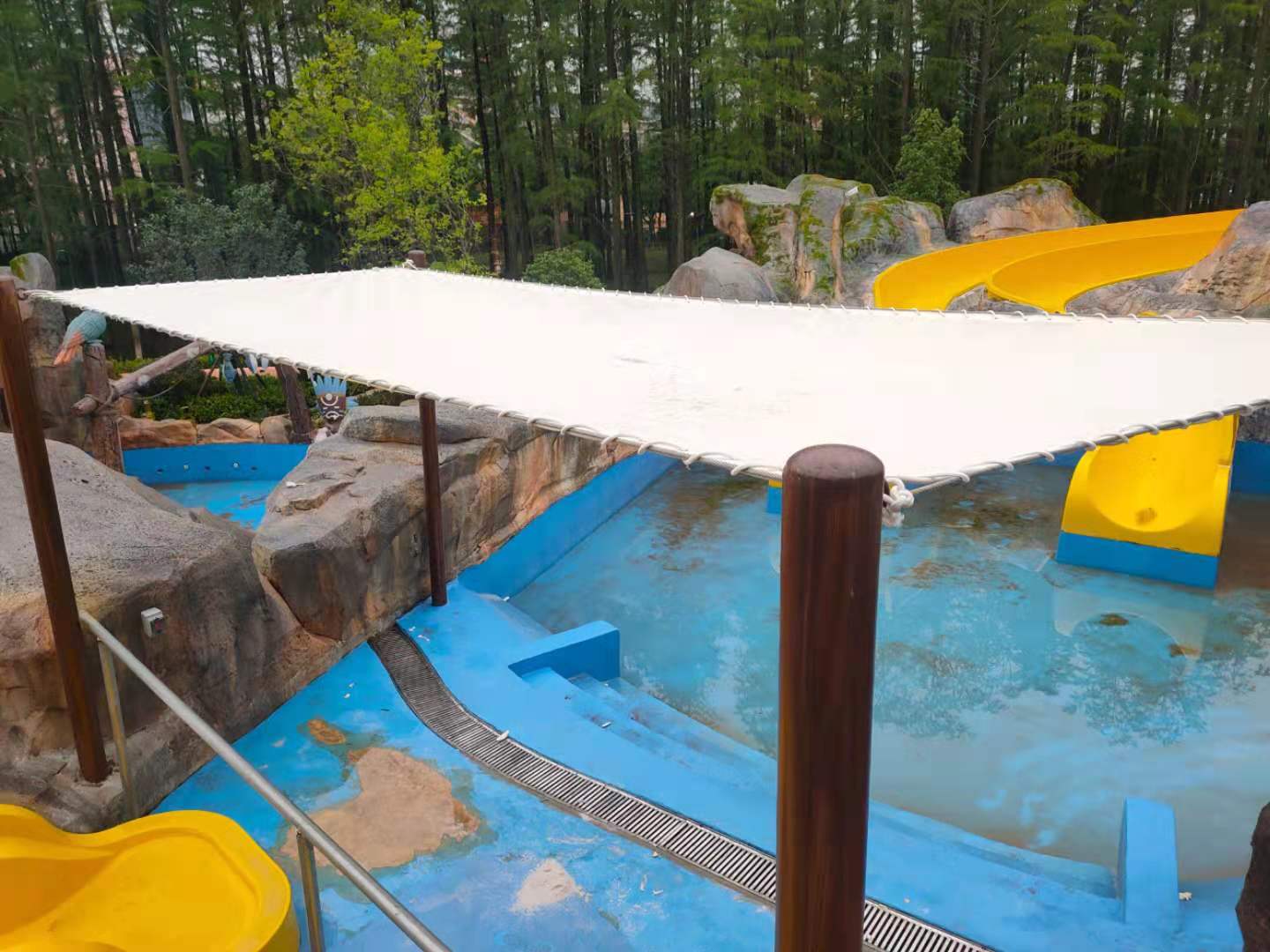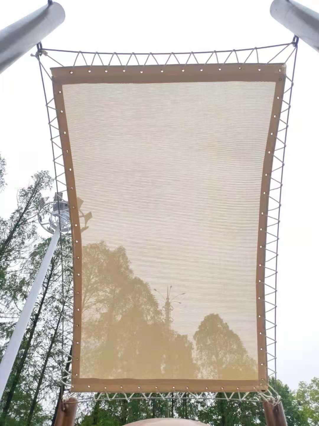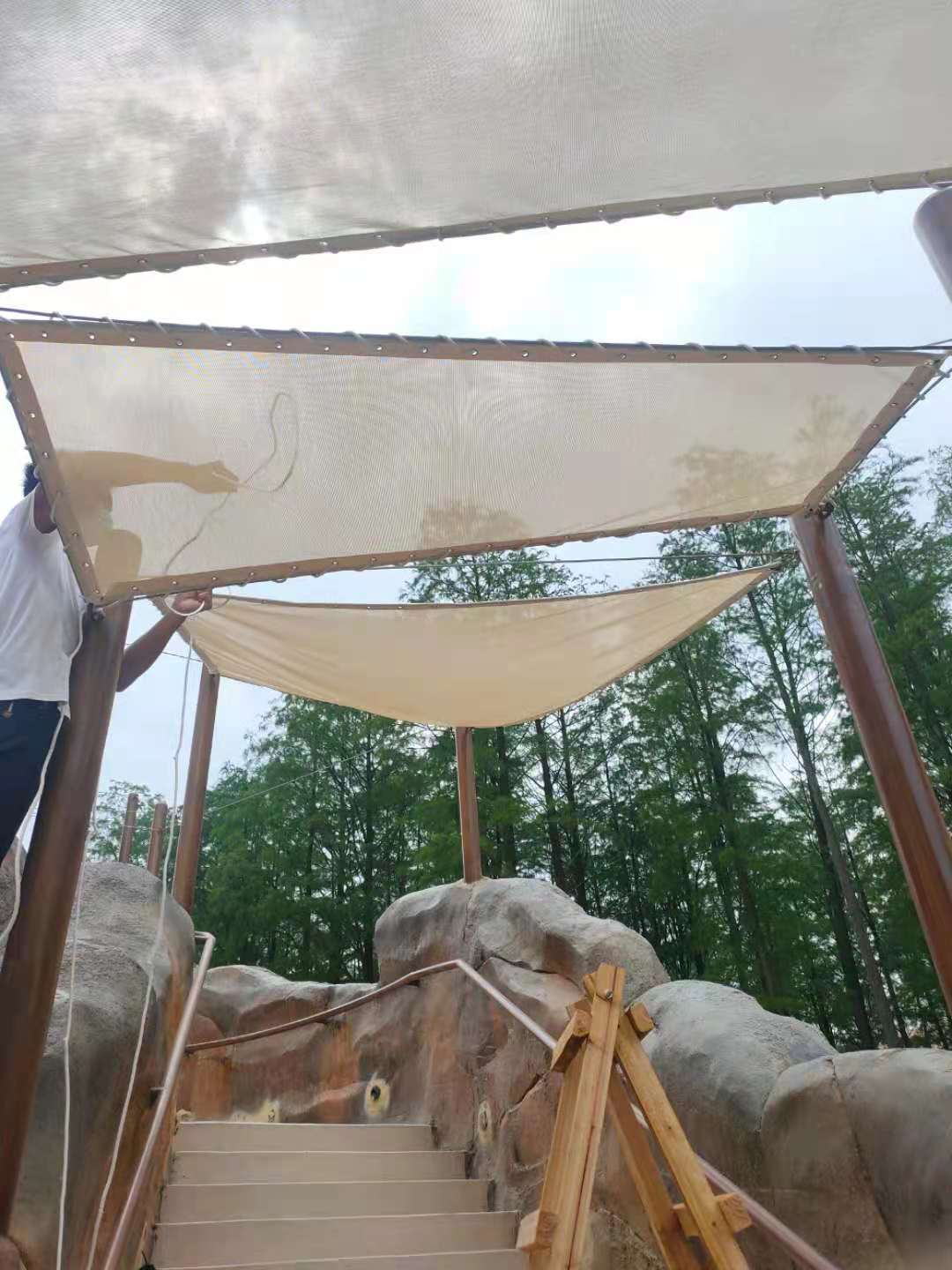 武漢瑪雅公園膜結(jié)構(gòu)景觀,是我公司與游樂設(shè)備公司配套工程,材料遮陽效果好,質(zhì)量輕,采用法國(guó)進(jìn)口彩色法拉利網(wǎng)格膜材,空運(yùn)到我廠深加工后,現(xiàn)場(chǎng)安裝完成的,完工時(shí)間2021年4月7日