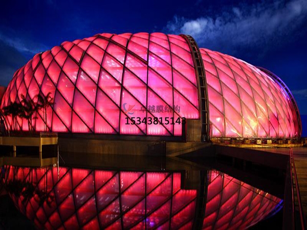 膜結(jié)構(gòu)是20世紀(jì)中期發(fā)展起來的一種新型建筑結(jié)構(gòu)類型,它打破了純直線建筑風(fēng)格的模式,以其獨(dú)有的優(yōu)美曲面造型,簡潔、明快、剛與柔、力與美的組合,給人耳目一新的感覺,同時給建筑設(shè)計師提供了更大的想象和創(chuàng)造空間。