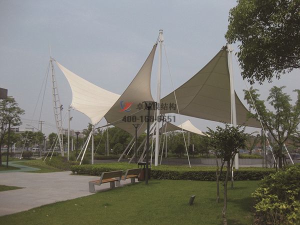 6、這是膜結(jié)構(gòu)景觀工程的案例,膜結(jié)構(gòu)所用的膜材本身具有良好的透光率,建筑空間白天可得到自然的漫射光,能節(jié)約大量照明能源;相對(duì)于傳統(tǒng)涂理PVC的聚醋纖維膜材,涂覆PTFE的玻瑞纖維膜材的透射光譜更加均勻具有外觀新穎,經(jīng)濟(jì)適用,適用壽命長(zhǎng),結(jié)構(gòu)更安全,質(zhì)量更可靠。