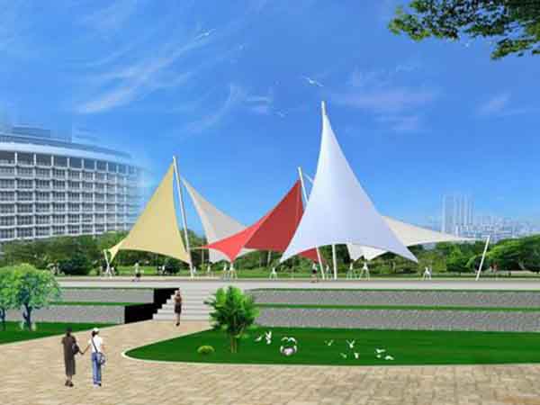 2、景觀膜結構是目前發(fā)展很快的一種新型空間結構,是一種效率極高的張力集成體系,可以充分發(fā)揮鋼索的強度與張拉整體結構的空間作用。它通過鋼骨架、鋼索與膜材共同受力形式穩(wěn)定曲面來覆蓋建筑空間,具有高度的形體可塑性和結構靈活性,即通過對膜材內部施加一定的預張力,使其具備了抵抗外荷載能力,從而充當結構材料的一種結構體系。我公司先后在池州地區(qū)承接了池州百荷公園景觀、皋城中心廣場景觀、池州萬達廣場景觀小品的設計施工,簡介如下: