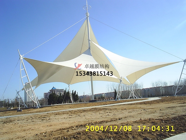 用于膜結(jié)構(gòu)中的高強(qiáng)度柔韌薄膜稱膜材,它是一種耐久用、高強(qiáng)度的涂層織物,由織物和涂層復(fù)合而成,具有質(zhì)地柔韌、厚度小、重量輕、透光性好的特點(diǎn)。對(duì)自然光吸收和透射能力、阻燃,具有良好的耐久、防火、氣密等特性;表面經(jīng)過(guò)氟素處理或二氧化鈦處理的膜材料抗老化性能好,具有較高的自清潔性。