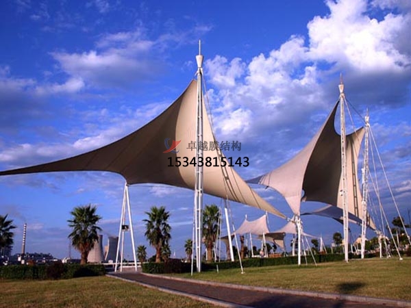膜結(jié)構(gòu)具有較好的隔熱效果,對太陽熱能可反射掉70%,膜材本身吸收了17%,傳熱13%,而透光率卻在20%以上,經(jīng)過10年的太陽光直接照射,其輝度仍能保留70%。這與它本身的材質(zhì)有關(guān)系。膜結(jié)構(gòu)跨度空間大指出其因為自重輕,膜結(jié)構(gòu)修建能夠不需要內(nèi)部支撐面大跨度掩蓋空間,這使大家能夠列靈活計和運用修建空間,描繪出愈加有構(gòu)思的修建。所以一般膜結(jié)構(gòu)建筑總能有著讓人賞心悅目的外觀設(shè)計,加上自身的實用經(jīng)濟性讓膜結(jié)構(gòu)得到了更多建筑的青睞之選。