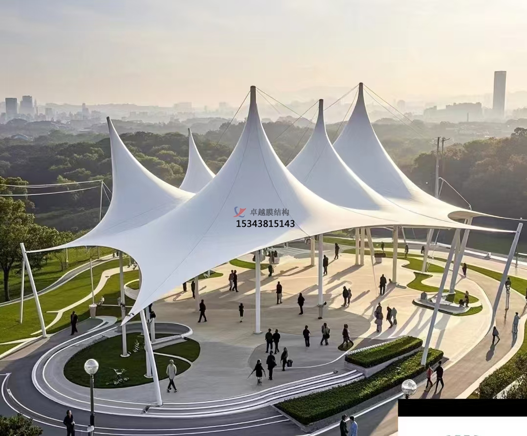 膜結(jié)構(gòu)具有高度的可塑性和適應(yīng)性,可根據(jù)場地的大小和形狀進(jìn)行設(shè)計(jì),使休閑廣場將建設(shè)具有更大的靈活性。