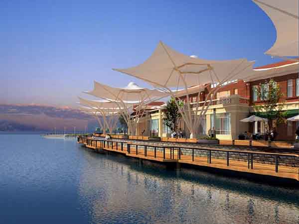 PTFE 膜材是采用獨有的技術方法將玻璃纖維紗進行四氟化乙烯樹脂涂層的一種復合材料;其玻璃纖維絲具有超強的拉伸強度,它的強度遠高于鋼材,具有非常強的抗蠕變性能。該膜材的彈性模量遠低于其它膜材,這有利于膜材形成復雜的曲面造型;PTFE 建筑膜材的涂層表面由于自由能極低,使該產品具有高度的自潔性能;依靠自然的雨水沖刷,材料表面就能保持干凈和潔白,該表面完全惰性化 : 惡劣的環(huán)境,如霉菌,酸雨等將不對 PTFE 膜表面起作用;PTFE 材料中不含容易移出的增塑劑,抗氧化劑,紫外線吸收劑等;并且防潮,防霉,耐污性能良好,不沾性能卓越;能夠在 -80℃到 +250℃的溫度范圍內安全使用,具有良好的耐熱性,耐濕性,耐化學性等特性,即使在承受了暴風雪這類惡劣天氣后,膜結構仍然能維持初始狀態(tài),膜材不會產生松弛。