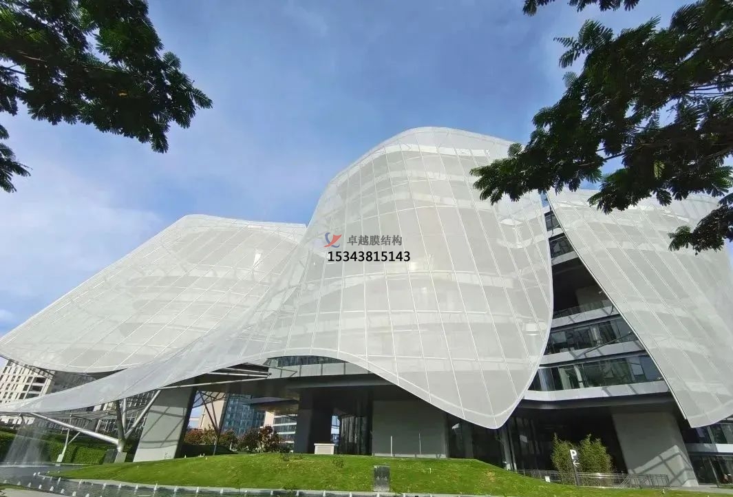半透明的PTFE網(wǎng)格膜以略微的距離遮蓋外部,同時作為遮陽板,可在炎熱的季節(jié)為建筑物提供通風。輕盈的外表給建筑物帶來了優(yōu)雅和懸浮的外觀,盡管其內(nèi)在邏輯結構為中央骨架結構。