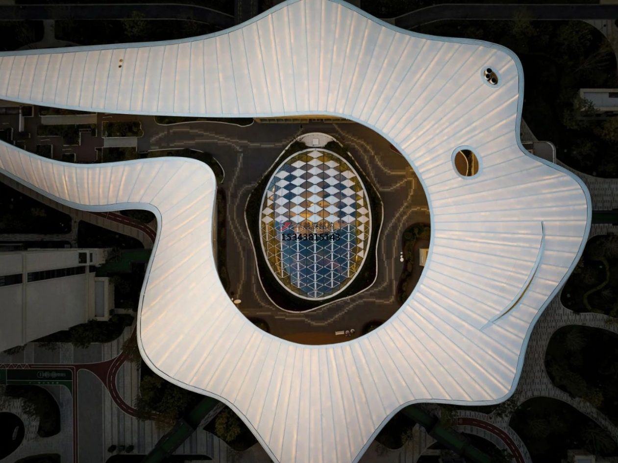 相對(duì)于四周規(guī)則的建筑形態(tài),活力中心呈現(xiàn)更加自由和充滿活力的有機(jī)形態(tài):如一顆水珠滴落,在場(chǎng)地中激起漣漪,自中心散開、升騰,形成一片白色、柔軟的云朵,最終轉(zhuǎn)化為自由的大屋頂。