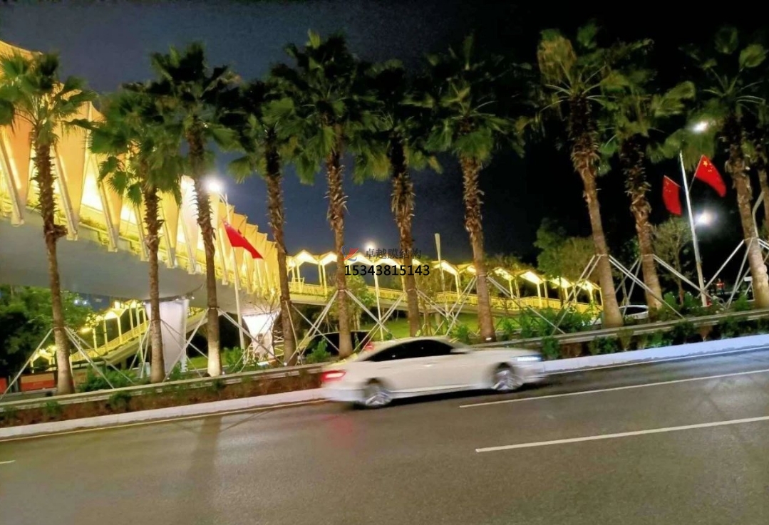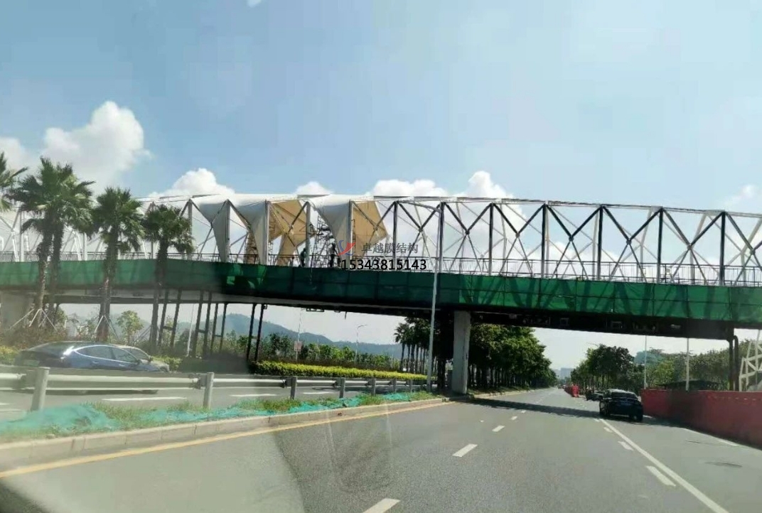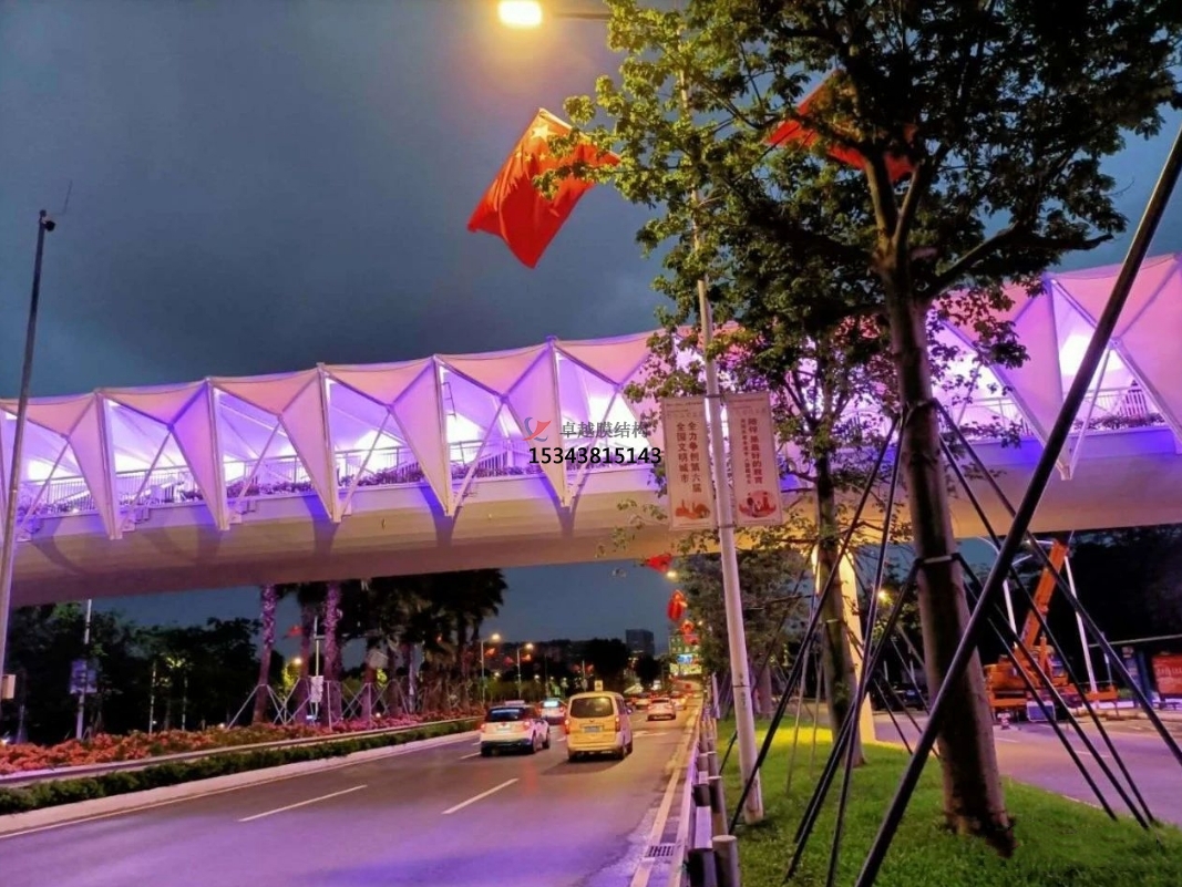 為了保質、保量、保證工期、保安全的情況下順利的把項目交到業(yè)主手中,把施工人員分成兩班晝夜不分,日夜加班,還要克服現(xiàn)場的高溫,施工節(jié)點的困難,而且每片膜材的尺寸也不相同,為了膜材裁剪精準,設計師每跨每跨的量尺寸,又復合尺寸,確保了天橋立面膜結構的安裝工程順利進行。