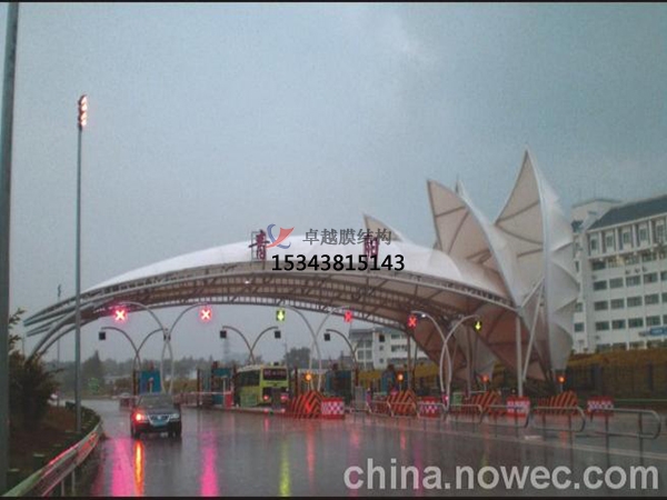膜結(jié)構(gòu)收費(fèi)站是近年來在國內(nèi)開始流行的一種新式的收費(fèi)站結(jié)構(gòu)。它與以往的舊式收費(fèi)站相比,結(jié)構(gòu)更加輕盈,而且在使用中比較穩(wěn)固。它的材料使用了高分子膜結(jié)構(gòu)材料和支撐構(gòu)件共同組成,并且能根據(jù)支撐構(gòu)件的高低位置不同而呈現(xiàn)不同的形狀。因此在教育,商業(yè),體育館等公共場所都有很廣泛的應(yīng)用 收費(fèi)站在更初是作為一種能提供給車輛泊的地方,使車輛避免了直接面對風(fēng)吹雨打。用來保證自行車,汽車等在收費(fèi)站下不受損傷。