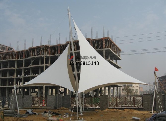 這是我司太原及周邊地區(qū)完工的膜結(jié)構(gòu)景觀工程案例,膜結(jié)構(gòu)景觀給人們對白色或米白色膜材會(huì)有很好的色彩感知,因?yàn)檫@兩種色彩表現(xiàn)出對可見光具有線性光譜透射的特點(diǎn)。透射程度隨透射光波長的增加而增加,這使得透射光比人射光還略溫暖。透射光譜與纖維及其特點(diǎn)、涂層的厚度以及附加面層有關(guān),相對于傳統(tǒng)涂理PVC的聚醋纖維膜材,涂覆PTFE的玻瑞纖維膜材的透射光譜更加均勻具有外觀新穎,經(jīng)濟(jì)適用,適用壽命長,節(jié)能透光等優(yōu)點(diǎn)。深受廣大用戶的好評(píng),我司所有工程全部通過專業(yè)膜結(jié)構(gòu)軟件計(jì)算通過,結(jié)構(gòu)安全,質(zhì)量可靠。