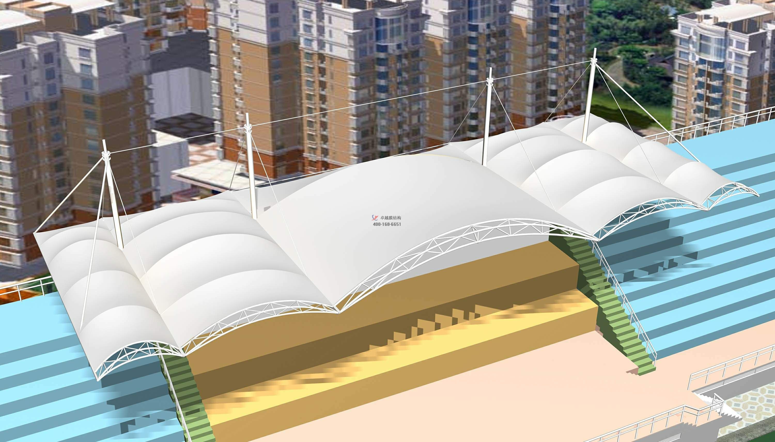 膜結(jié)構(gòu)看臺(tái)在體育設(shè)施上主要應(yīng)用在學(xué)校操場(chǎng)運(yùn)動(dòng)看臺(tái)或主席臺(tái)屋頂,另外大型體育場(chǎng)館看臺(tái)膜結(jié)構(gòu)屋頂也屢見不鮮??磁_(tái)造型般由貝殼形峰膜及部張拉膜組成,形式新穎活潑。膜結(jié)構(gòu)看臺(tái)將鋼架、索、膜巧妙結(jié)合,通過薄膜、膜邊索、脊索、谷索、拉索、拉桿及定的格構(gòu)梁來穩(wěn)定。膜頂平滑過渡,結(jié)構(gòu)美觀、輕巧、整體造型相互輝映,別具格,接下來我們起來看看膜結(jié)構(gòu)看臺(tái)的設(shè)計(jì)是怎么樣的。