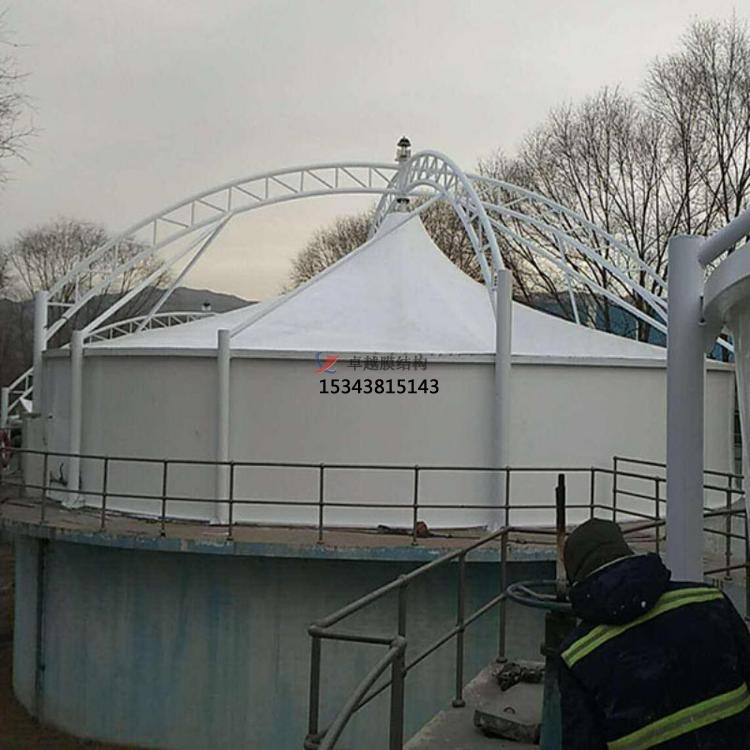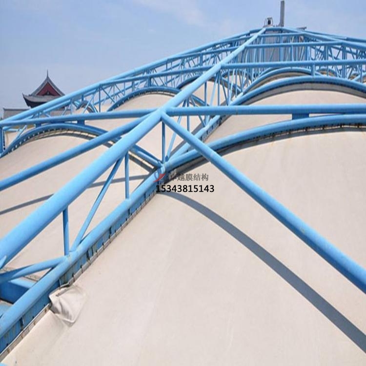 鋼架反吊膜結構是專門用于污水池加蓋密閉的一種膜結構形式,結構形式新穎,防腐耐霉,由鋼結構、膜結構及安裝輔件構成,根據(jù)不同污水池現(xiàn)場條件進行個性化設計安裝。鋼結構在外部形成穩(wěn)定受力結構,膜材料反吊與機構內,隔絕廢氣對剛架構的腐蝕。鋼架反吊膜分為圓形反吊膜和方形反吊膜,其中方形反吊膜又分為拱形及吊帽結構。