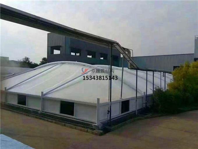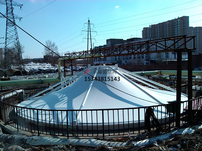 2.確認(rèn)膜材的品種:污水池加蓋除臭選用的膜材有許多中,應(yīng)根據(jù)池體的跨度挑選適宜的膜材才干達(dá)到預(yù)期的作用.一般,關(guān)于大跨度而言,選用污水池專用膜材氟碳纖維膜比較適宜,因?yàn)檫@種膜材具有很強(qiáng)的抗腐蝕能力,能對池內(nèi)廢氣起到抗腐蝕的作用,無形中保證了膜材的使用壽命;