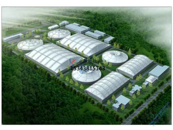 鄭州市卓越膜結構工程公司是集污水池加蓋反吊膜加蓋工程設計施工、結構設計、靜動力計算分析、整體結構安裝以及使用維護于一體的綜合性工程公司。污水池反吊膜結構中的高強度柔韌薄膜稱膜材,它是一種耐腐蝕、耐高溫、耐久用、高強度的樹脂類涂層織物,由多種復合PVC樹脂涂層刀刮成型,具有質地柔韌、厚度小、重量輕、透光性好的特點。對自然光吸收和透射能力、阻燃,具有良好的耐久、防火、氣密等特性;表面經(jīng)過特氟龍?zhí)幚砘蚨?a title="氧化">氧化鈦抗老化處理,具有較高的自清潔性能。下面就大家介紹一下我公司在臺州市地區(qū)完成的部分污水池膜結構封閉項目。