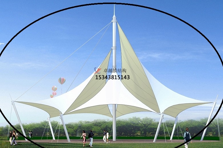 景觀園林膜結構特點:其具有造型美觀獨特、透光性好、環(huán)保節(jié)能、自重輕、施工便捷、耐用性強、功能多樣等特點。膜結構可以通過張拉形成各種獨特的曲面造型,如波浪形、傘狀、樹形等,能夠與自然環(huán)境完美融合,打造出極具藝術感和視覺沖擊力的景觀效果,為園林增添別樣的魅力。膜材具有優(yōu)良的透光性,透光率一般在 20%-95%之間,白天可以讓自然光均勻地漫射進來,使園林空間更加明亮、舒適,同時節(jié)約大量照明能源,夜間在燈光的映射下又能營造出絢麗多彩的光影效果。膜結構采用的膜材可回收利用,符合綠色建筑理念,而且其良好的保溫性能和反射光熱作用,能有效降低建筑的能耗,減少對空調等設備的依賴。膜材料自重僅為鋼結構的 1/8,混凝土的 1/40,因此對地基基礎的要求較低,可建成大跨度的建筑,并且在地震等自然災害發(fā)生時,具有良好的抗震性能。膜結構的預制化程度高,現(xiàn)場安裝速度快,能夠大幅縮短工期,減少施工對場地和周邊環(huán)境的影響。常用的膜材如 PTFE、ETFE 等具有良好的耐候性、抗紫外線能力和防火性能,能夠適應各種惡劣天氣條件,使用壽命長達 15-30 年。不僅可以作為遮陽避雨的設施,還能作為景觀雕塑、燈光載體、休息亭、觀景平臺等,提升園林空間的使用價值和功能性。