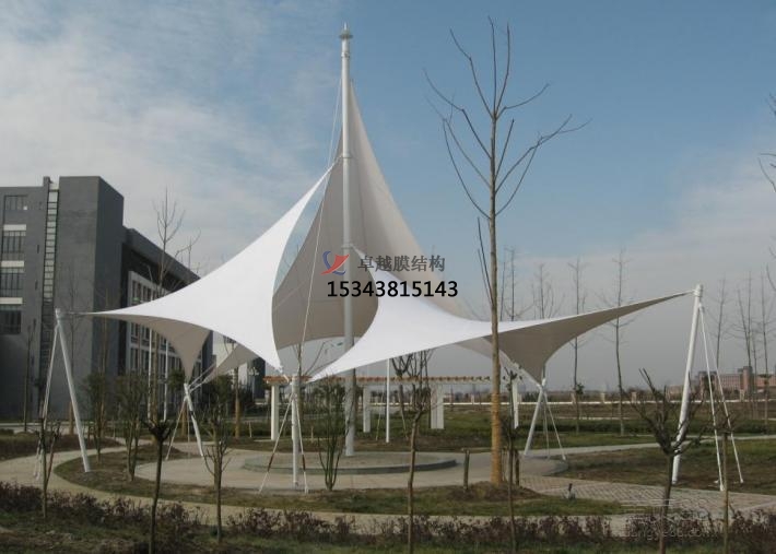 景觀膜結(jié)構(gòu)遮陽棚PVC材料的主要特點是強度低、彈性大、易老化、徐變大、自潔性差,但價格便宜,容易加工制作,色彩豐富,抗折疊性能好。為改善其性能,可在景觀膜結(jié)構(gòu)遮陽棚表面涂一層聚四氟乙烯涂層,提高其抗老化和自潔能力,其壽命可達到15年左右。