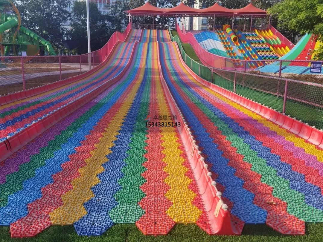 遮陽(yáng)棚架采用鋼結(jié)構(gòu)或混凝土結(jié)構(gòu),具有強(qiáng)度高、耐用性強(qiáng)等特點(diǎn)。遮陽(yáng)布采用高強(qiáng)度、防水、防曬的聚酯纖維材料,能夠有效阻擋紫外線和雨水的侵蝕,保護(hù)兒童的安全?;啦捎貌噬芰瞎?,設(shè)計(jì)為彩虹顏色,可供兒童滑行玩耍,增加樂(lè)園的樂(lè)趣。