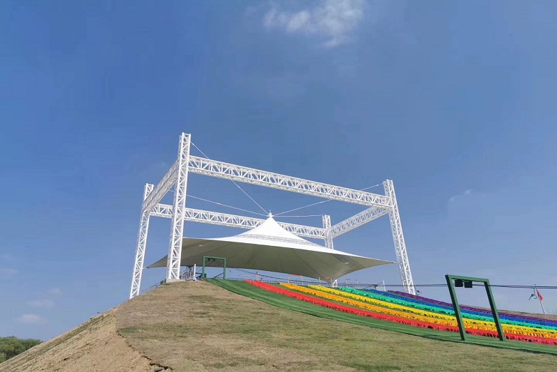 景觀張拉膜以其輕盈飄逸的造型,柔美并帶有力量的曲線和大跨度和大空間的鮮明個性和標識性,應用于城市小品設計中,膜結構景觀把人們帶入五彩繽紛,千姿百態(tài)的世界。以人為本,先天本性相合已是現代建筑環(huán)境學遵循的宗旨,是現代化城市建設必須遵守的原則。廣泛應用于小區(qū)園林景觀張拉膜,公園膜結構,廣場張拉膜等各個地方。