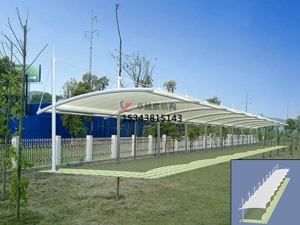 膜結(jié)構(gòu)車(chē)棚是現(xiàn)代非常流行的一種車(chē)棚建筑,對(duì)于這類(lèi)車(chē)棚的防雷措施應(yīng)根據(jù)不同的設(shè)計(jì)造型及覆蓋面積進(jìn)行設(shè)計(jì)。當(dāng)支承膜面的鋼構(gòu)桅桿、柱采用油漆或鍍鋅防腐時(shí),可直接作為避雷線和垂直接地導(dǎo)電線。如果桅桿采用噴塑等防腐,尚應(yīng)加避雷線,但可作為地線。