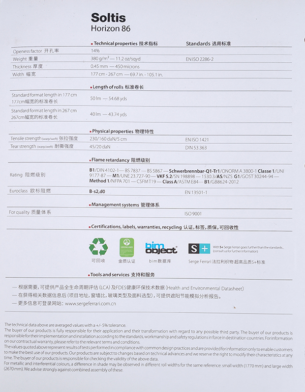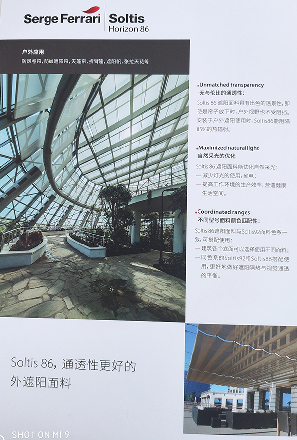 紗帝飾:紗帝飾面料為抵擋熱量和光線的真正盾牌,依靠其微型通風結(jié)構(gòu),調(diào)節(jié)陽光的熱效應(yīng),有效地防眩目。紗帝飾面料具有46種顏色,可為所有建筑,無論是 公眾場合還是私人住宅提供配套的眾多色彩和多種用途。法拉利預(yù)應(yīng)力專利制造技術(shù)給紗帝飾織物帶來尺寸恒定,不會變形,無需加固自然抗撕拉,耐久和抗塵,占 地面積小等獨有特性,更顯出紗帝飾面料對建筑物技術(shù)性遮陽無可匹敵的優(yōu)勢。