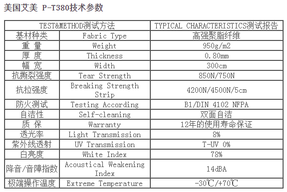 艾美PTFE膜材,本產(chǎn)品具有很好的柔韌性及高抗拉、抗撕裂強(qiáng)度,超細(xì)玻璃纖維絲織物基布(3-5微米絲徑)涂層PTFE (聚四氟乙烯),在 -50℃到+200℃溫度范圍內(nèi)安全使用,具有良好的耐熱、耐濕等特性,同時(shí)提高了產(chǎn)品的抗彎曲、抗折、抗磨損性,使用壽命可達(dá)25年甚至更長的時(shí)間。